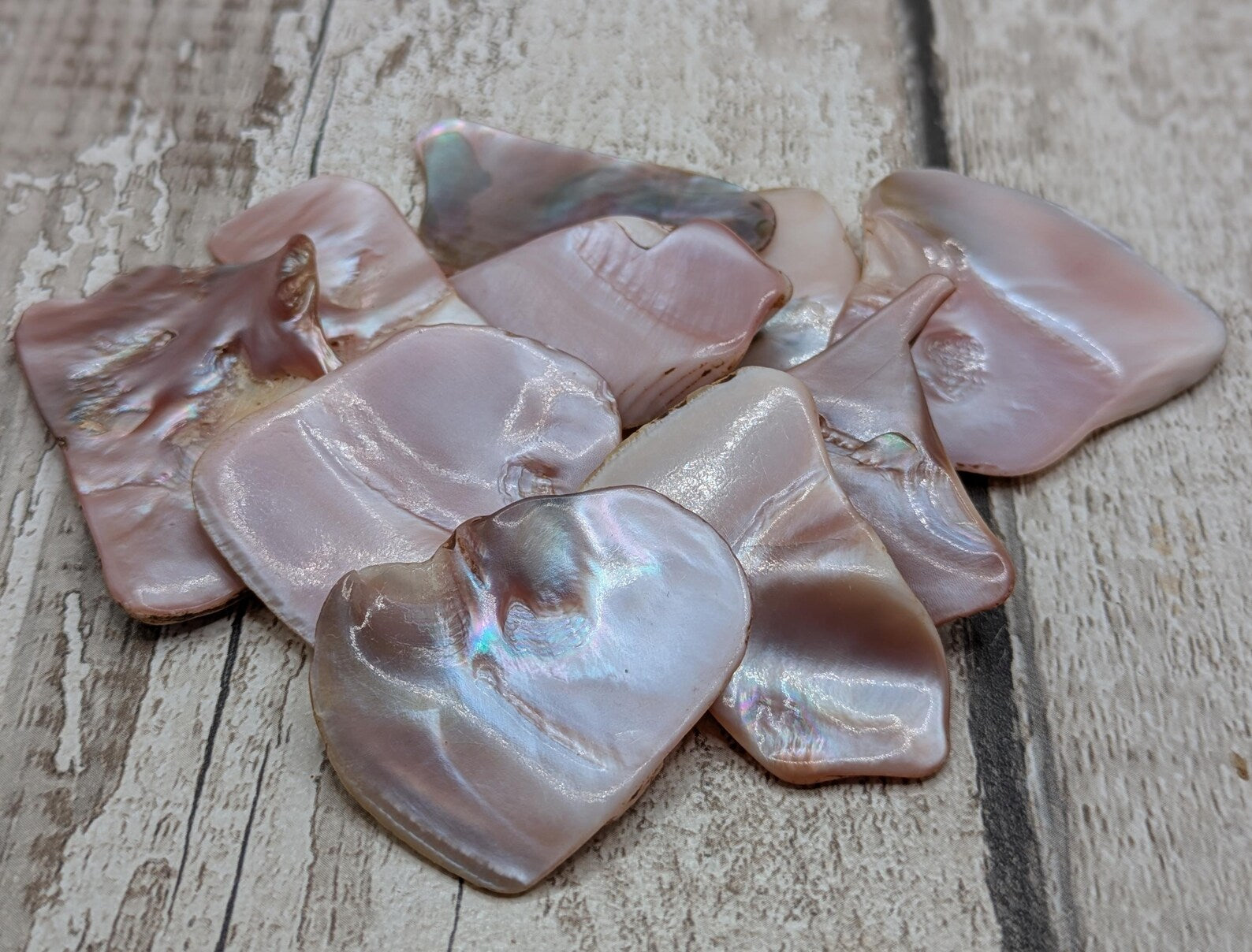 1 natural freeform New Zealand pink freshwater mussel shell pieces, left as they were found and lightly polished with a natural polishing compound to bring out their stunning pearlescent and soft pink tones. Each piece is unique, showcasing the organic shapes, textures, and natural color variations of the shell.