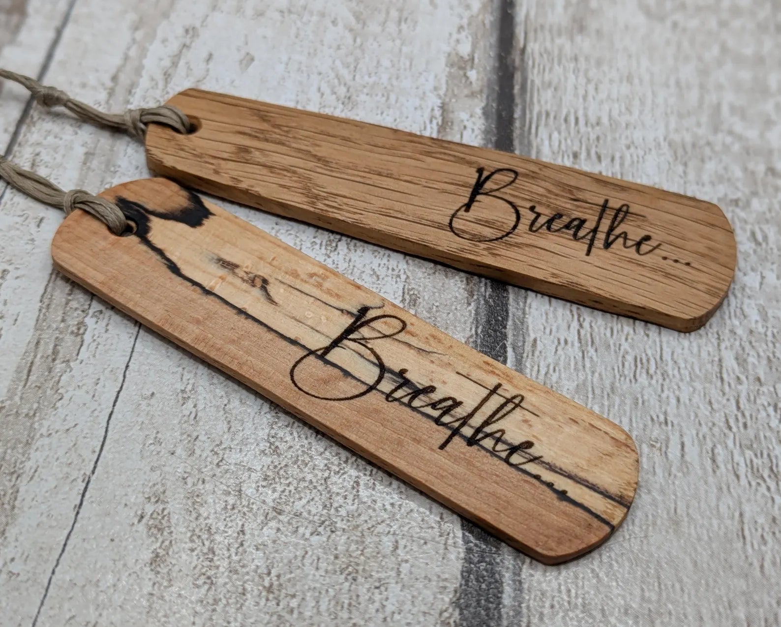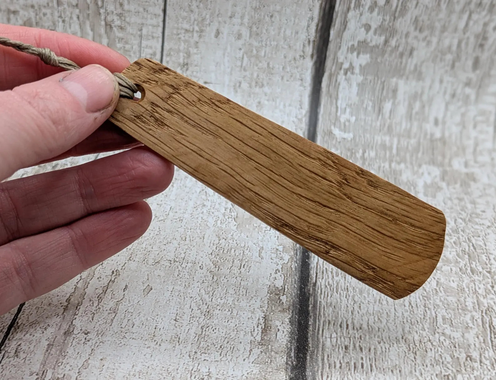 Crafted from reclaimed oak wood offcuts, this bookmark is shaped and finished in the studio before being laser engraved with the word reality in flowing script.