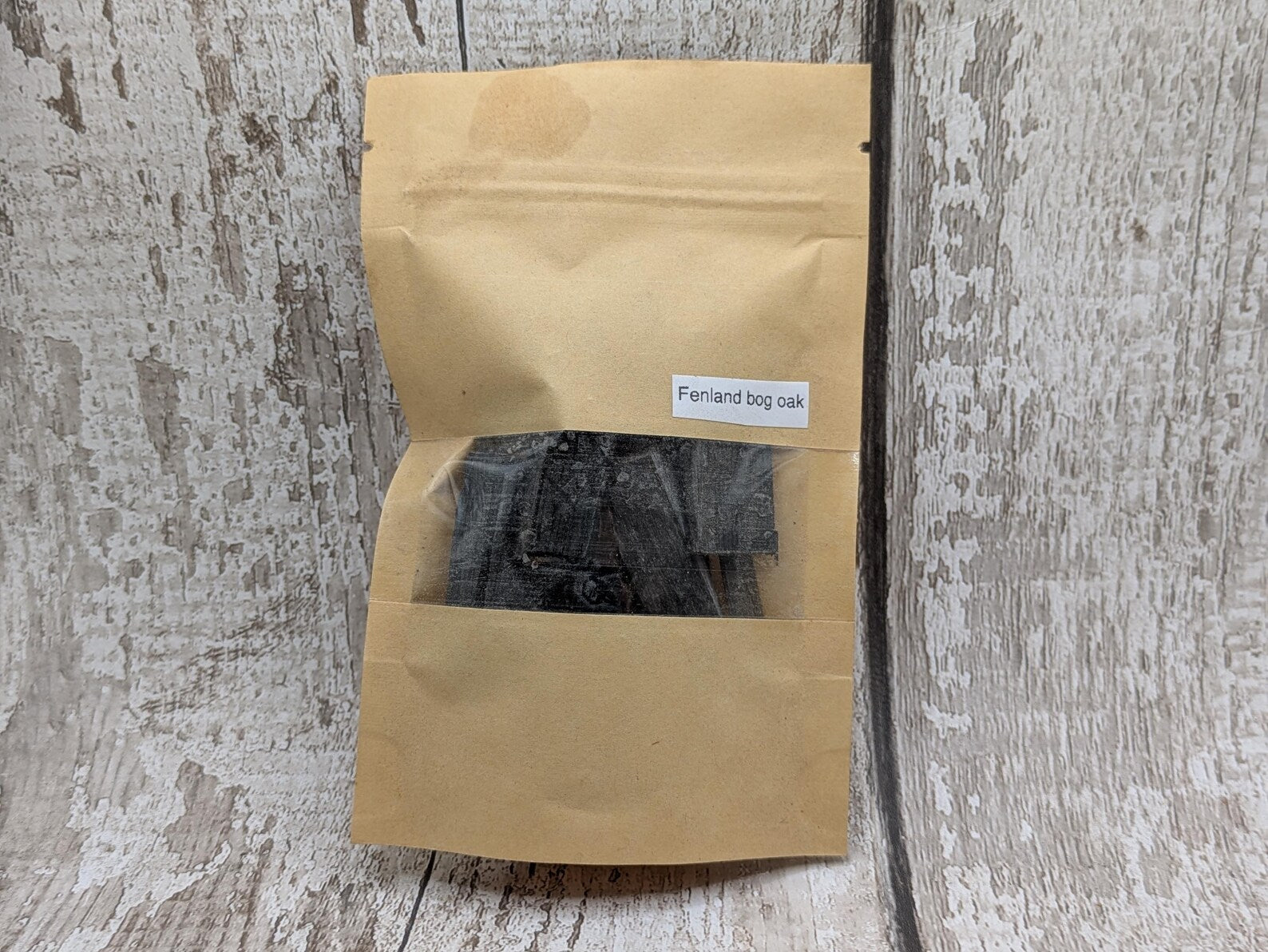 A small kraft pouch or bundle of unrefined Fenland Bog Oak offcuts