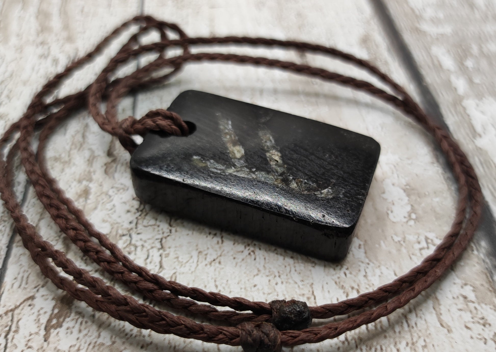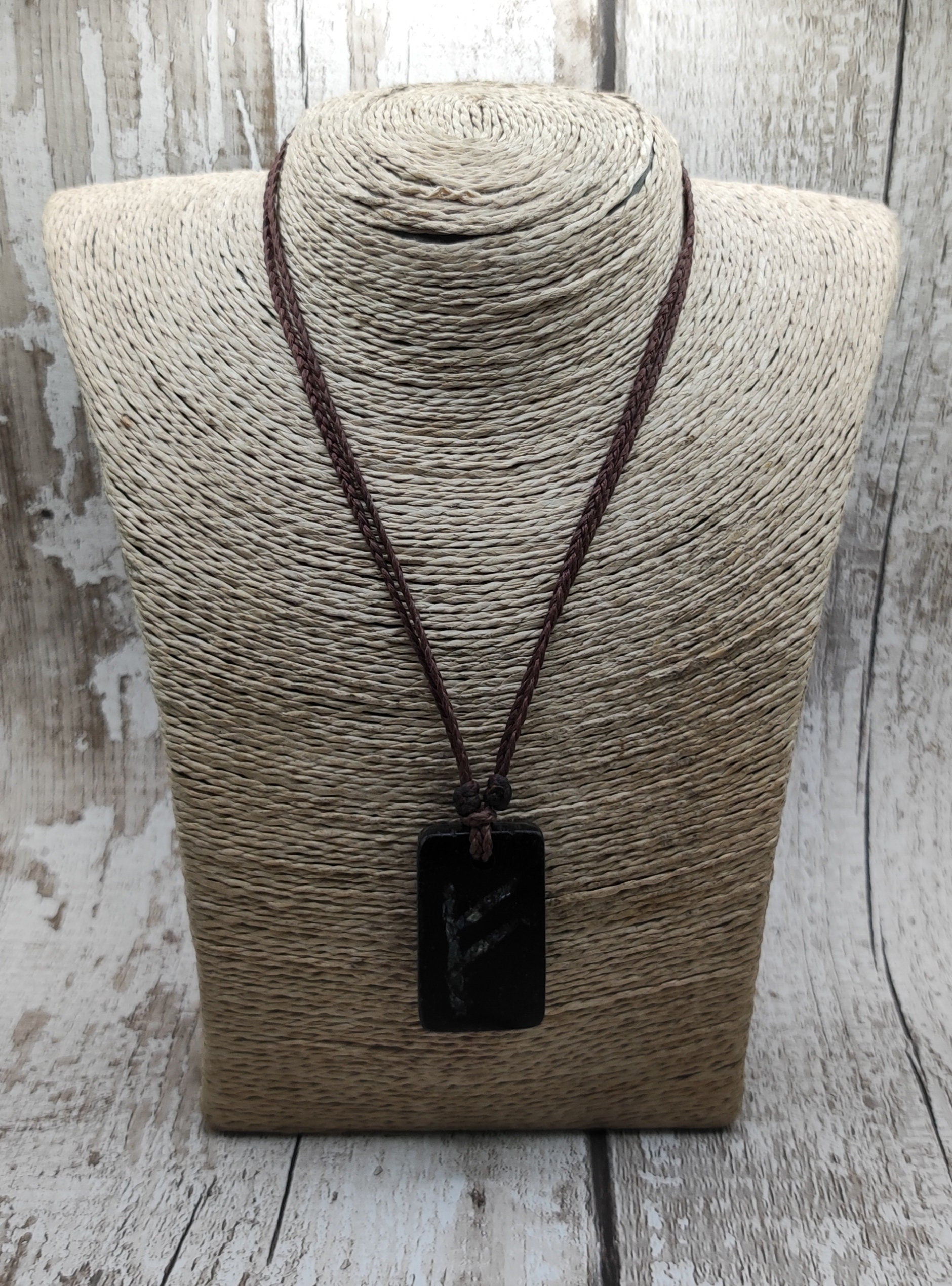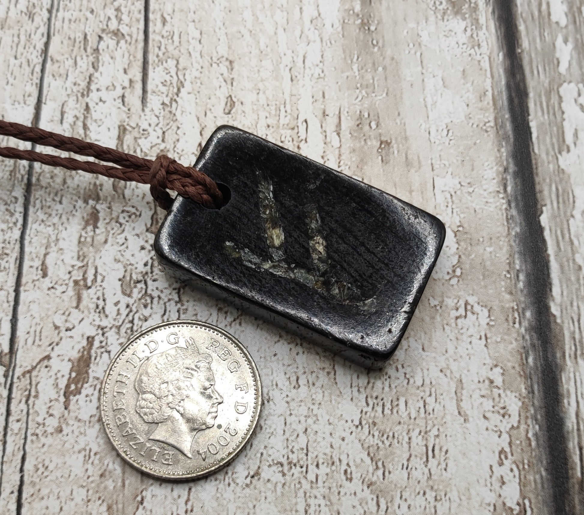 Introducing our Fenland Bog Oak Rune Pendant featuring the ancient Fehu rune, a symbol of abundance, wealth, and the transformative power of prosperity. Crafted from the resilient fenland bog oak, estimated to be around 7000 years old, this rectangular shaped pendant carries the weight of centuries. The bog oak, steeped in historical significance, symbolizes endurance, strength, and a profound connection to the earth.