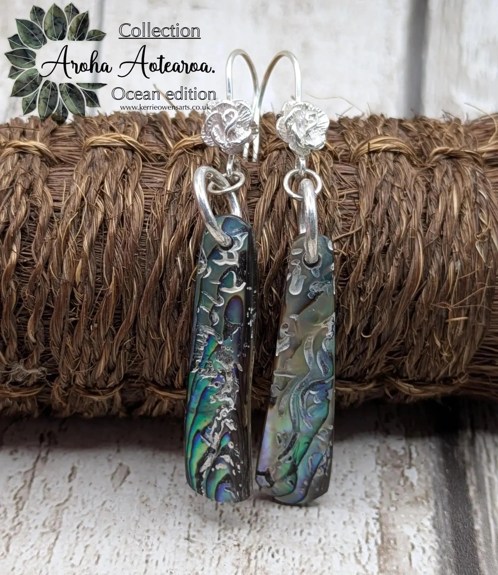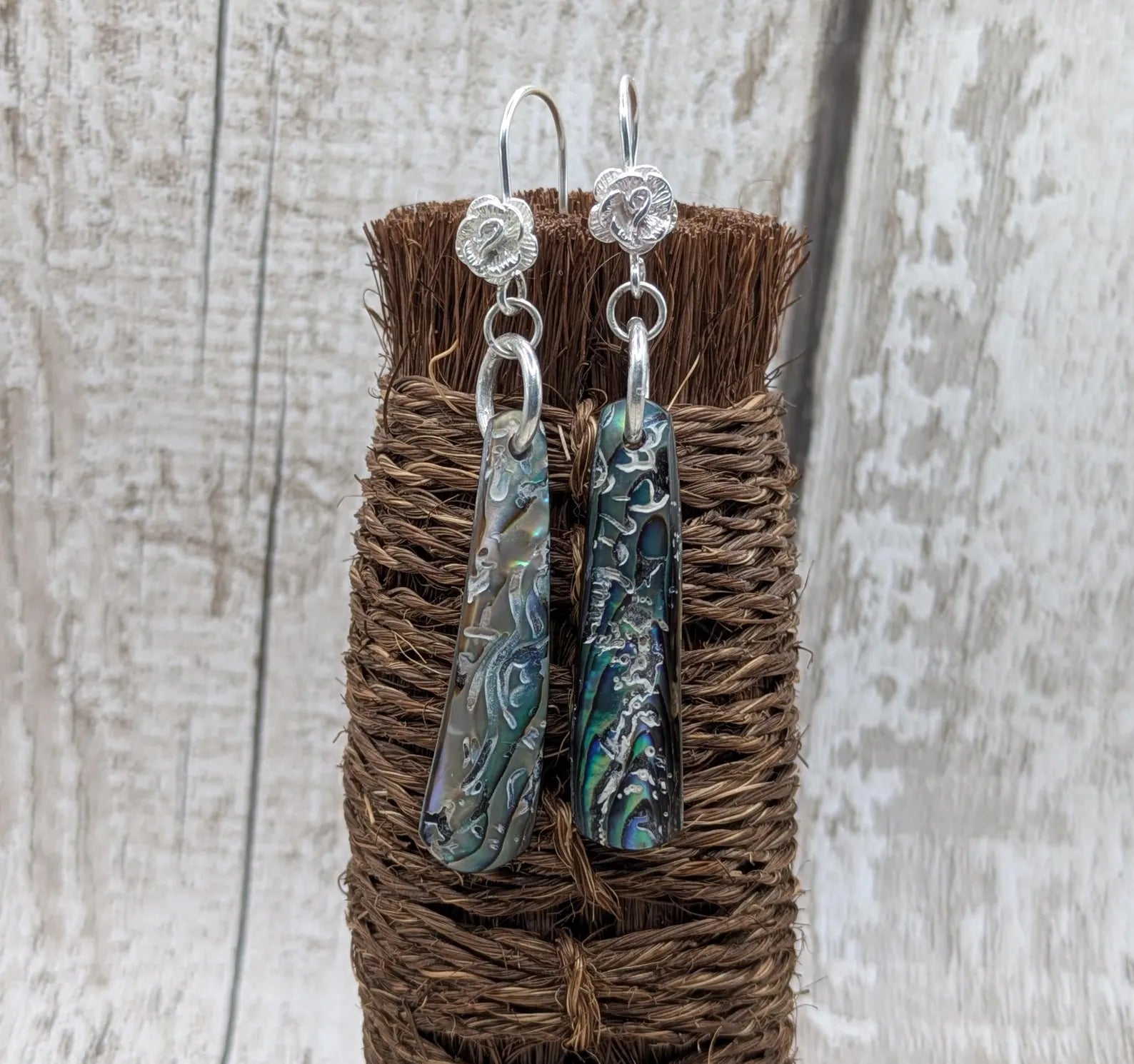 Hand-Polished Kaikōura Pāua Shell fish hook Earrings – Long Drop 925 Sterling Silver wild beachcombed Abalone unisex ocean themed Jewellery