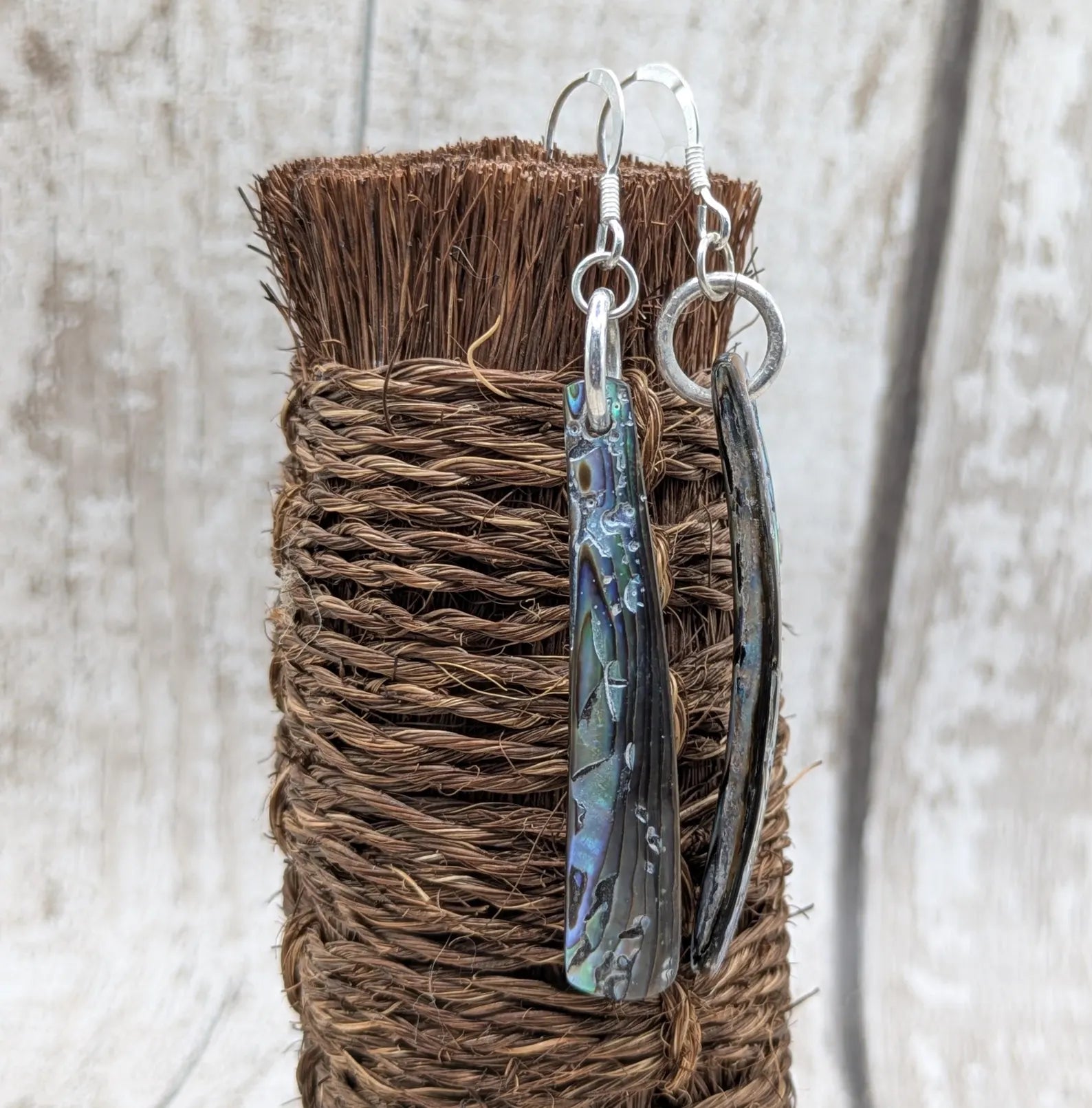 Hand-Polished Kaikōura Pāua Shell fish hook Earrings – Long Drop 925 Sterling Silver wild beachcombed Abalone unisex ocean themed Jewellery