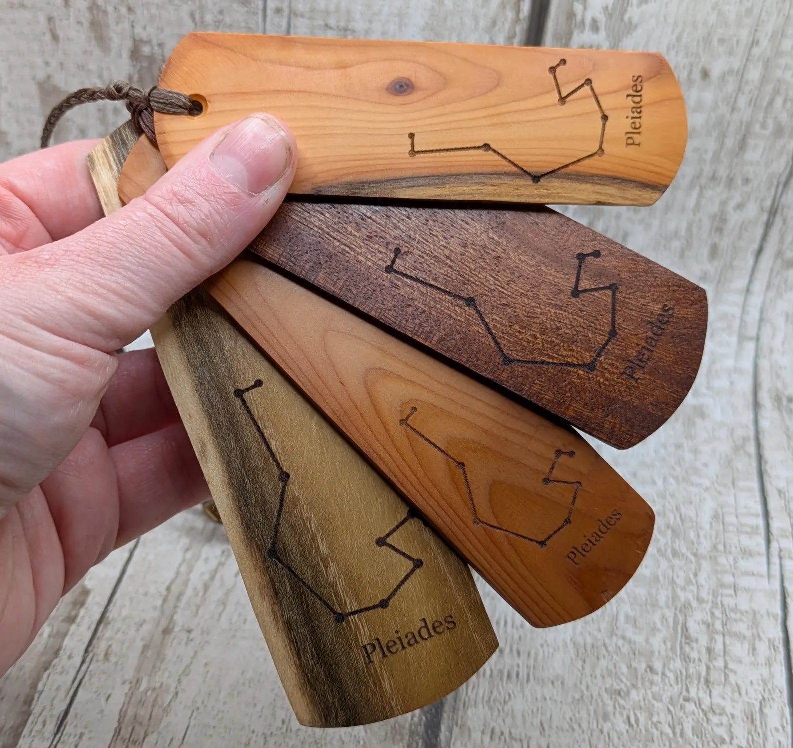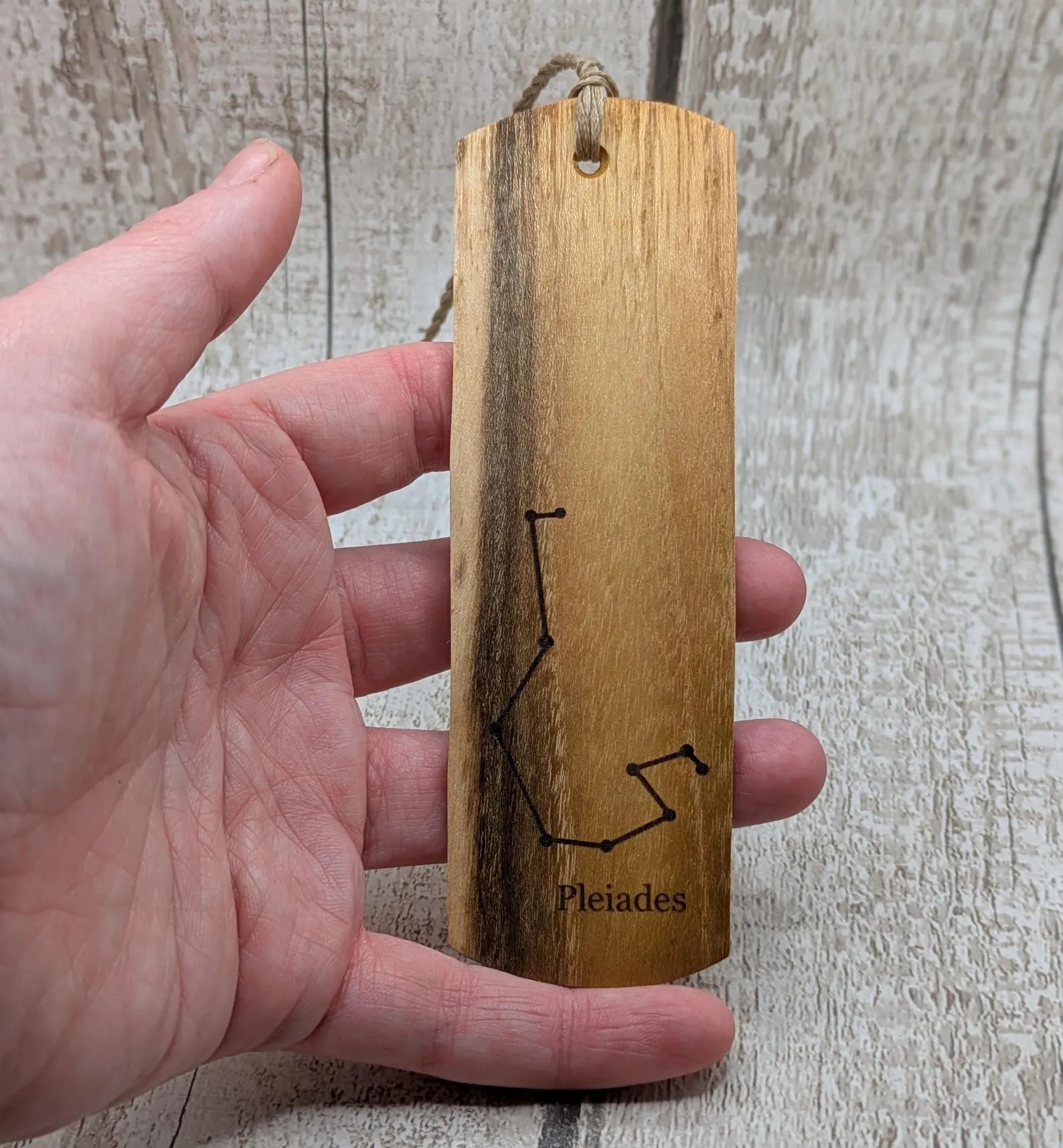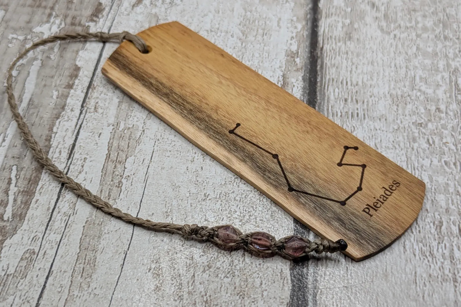 Laburnum wood hand made bookmark with Pleiades constellation laser print.