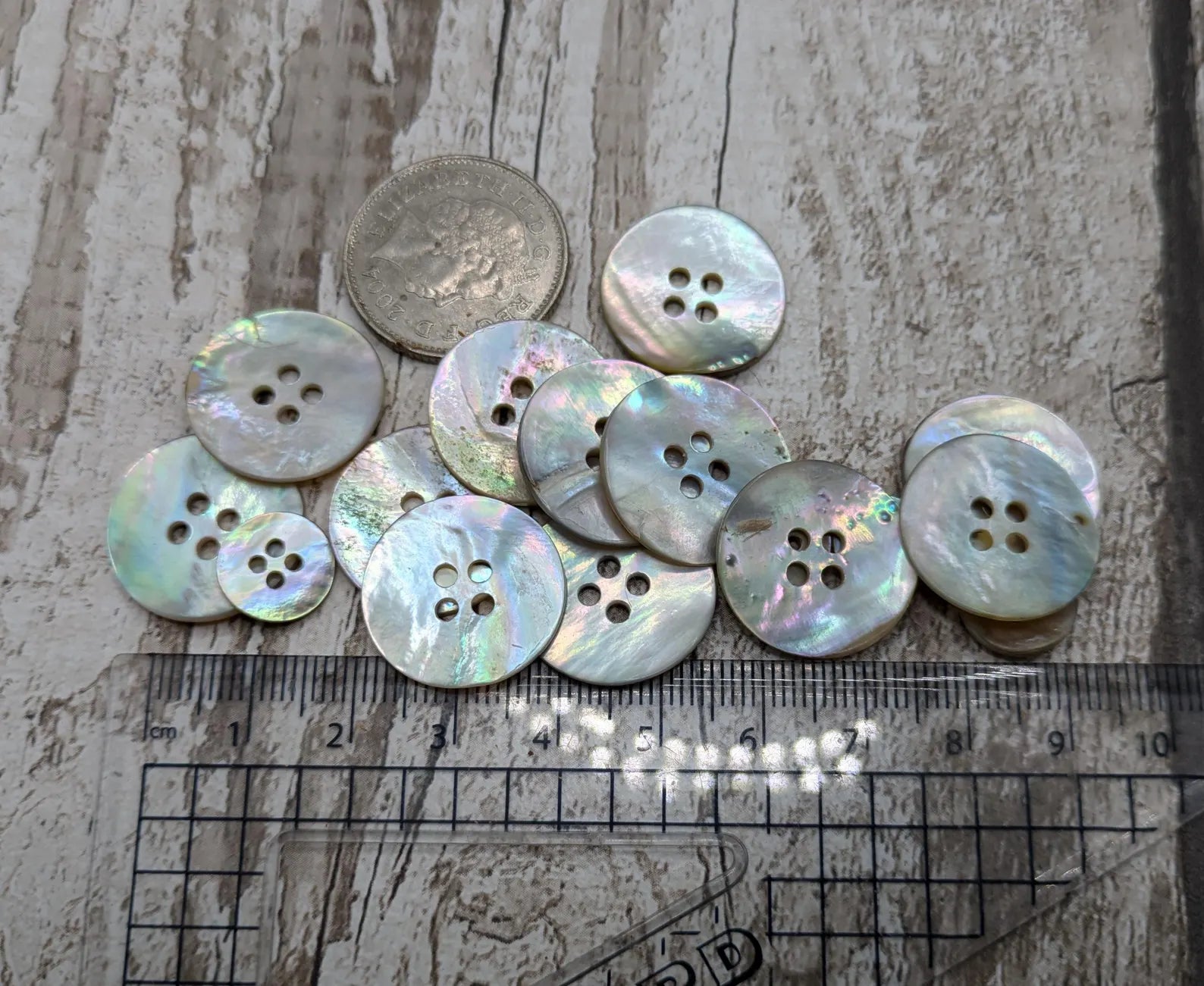 These four-holed abalone shell buttons are beautifully iridescent, with vibrant natural colours that shift between blues, greens, and purples. Originally intended for previous projects, they’ve never been used and are now ready to find new life in the hands of other craftspeople and jewellery makers.