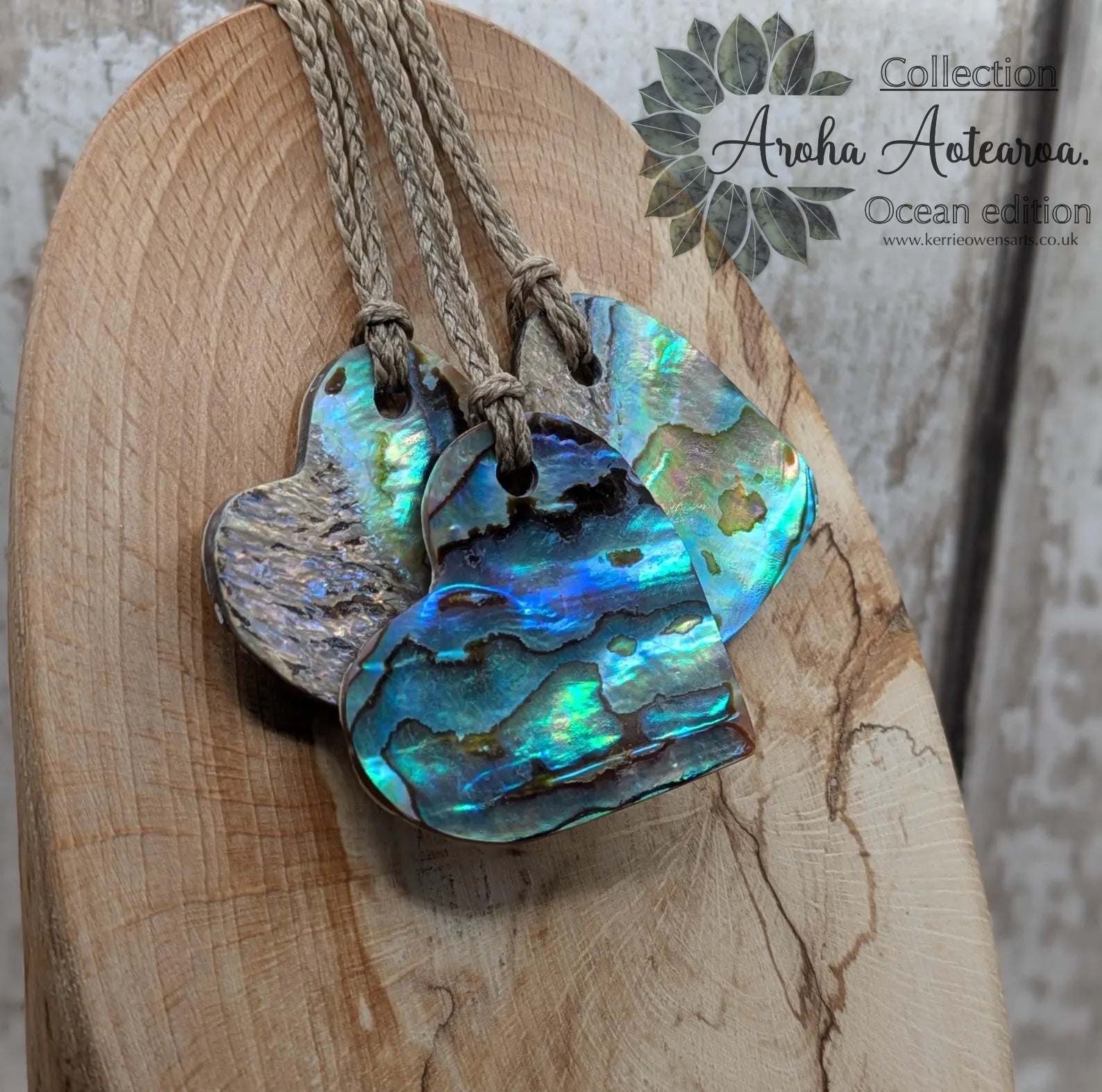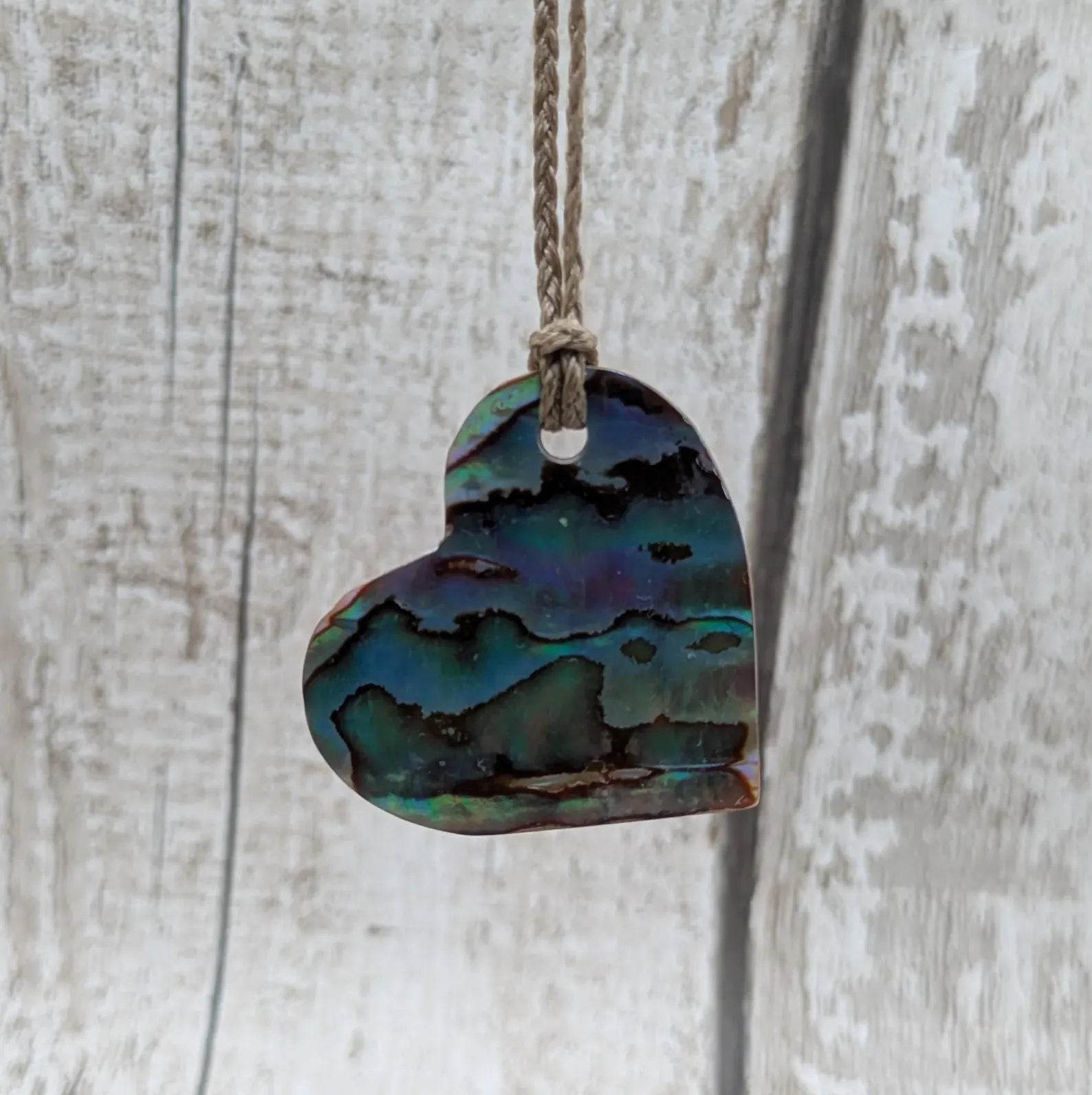 New Zealand Rainbow Pāua Heart Pendant – sea ocean themed love Tonga, Iridescent Abalone Necklace on Adjustable Waxed Cord.