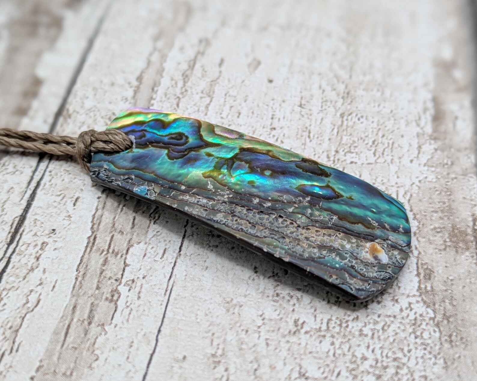 New Zealand Rainbow pāua shell pendant - iridescent abalone necklace, trapezoid shape, oceanic gift, hand crafted jewellery.