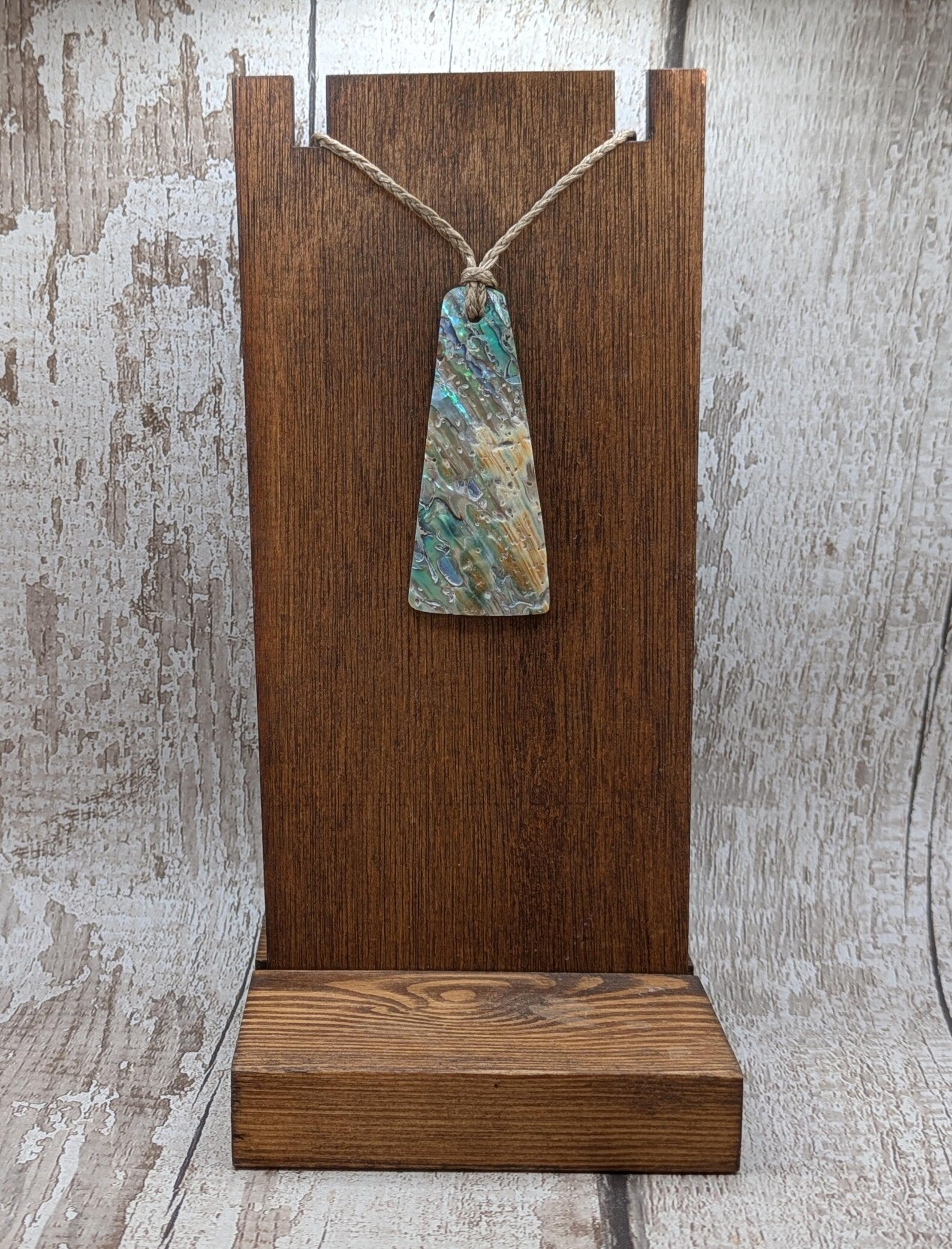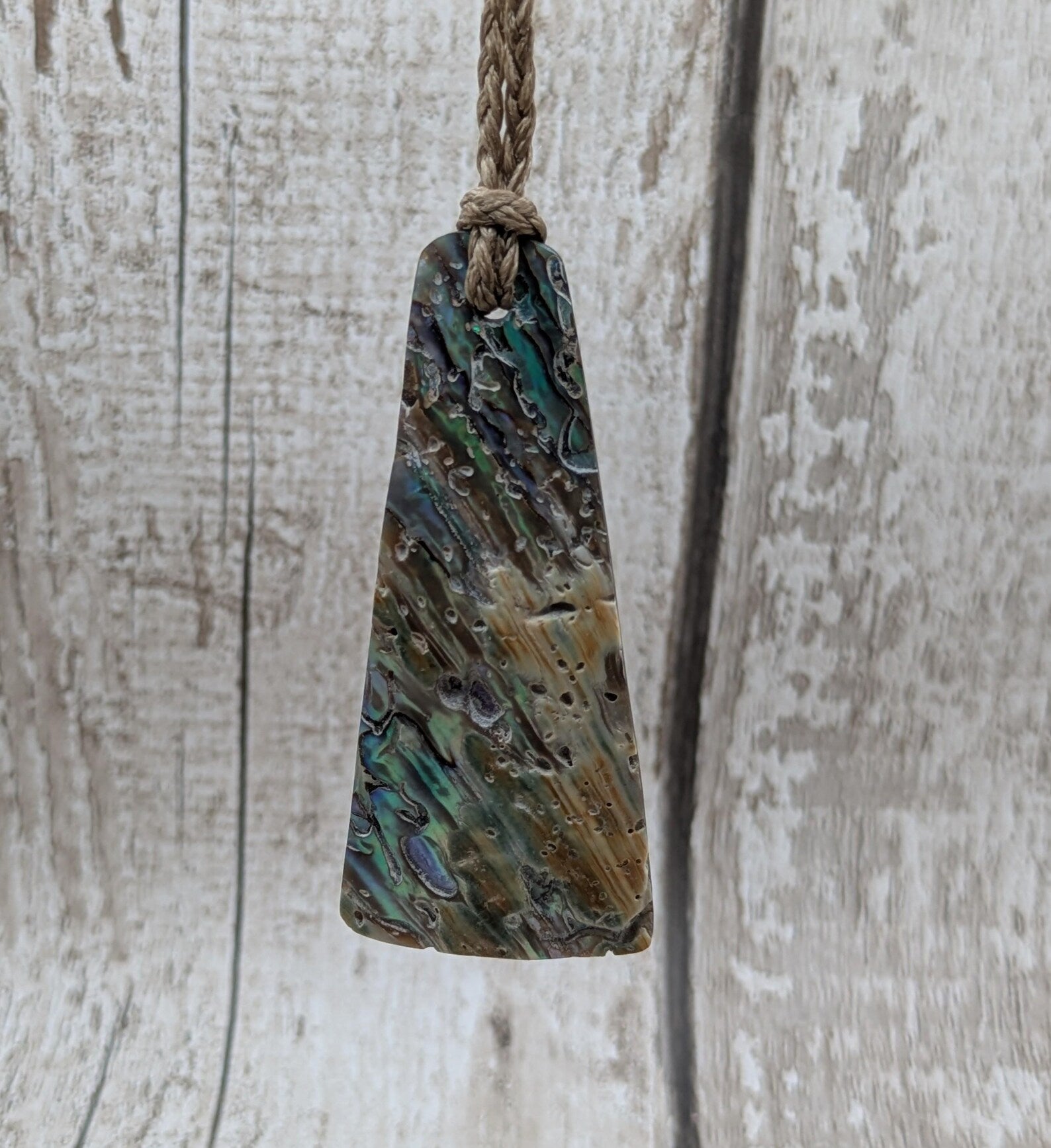 New Zealand Rainbow pāua shell pendant - iridescent abalone necklace, trapezoid shape, oceanic gift, hand crafted jewellery.