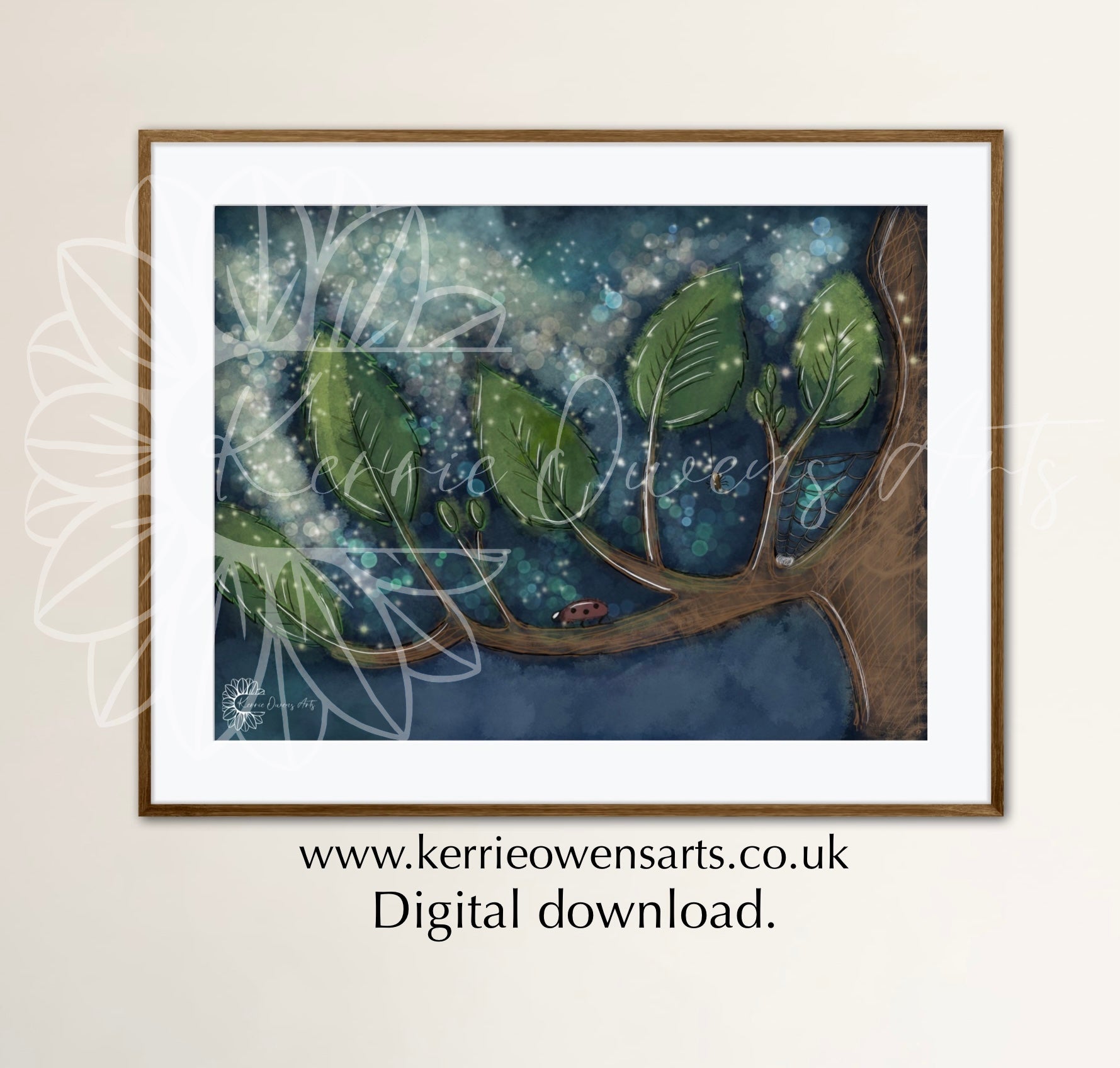 Step into a magical world with our stunning Night Time Woodland Glow digital download. This enchanting horizontal illustration captures the serene beauty of a moonlit forest, perfect for adding a touch of whimsy to your home decor. Imagine the ethereal glow of fireflies dancing amidst the trees, creating a dreamy atmosphere in any space.