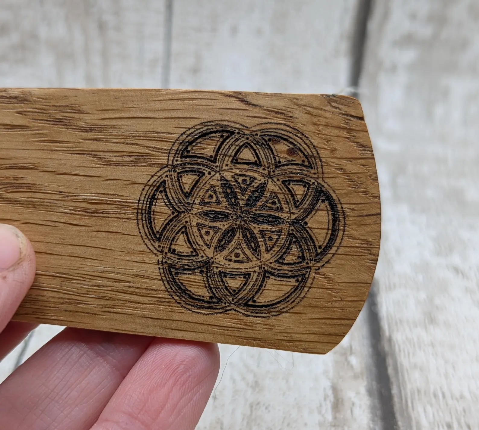 Handcrafted from reclaimed oak wood offcuts, this bookmark is shaped in the studio and laser engraved with a layered sacred geometry design featuring the Seed of Life and Flower of Life.