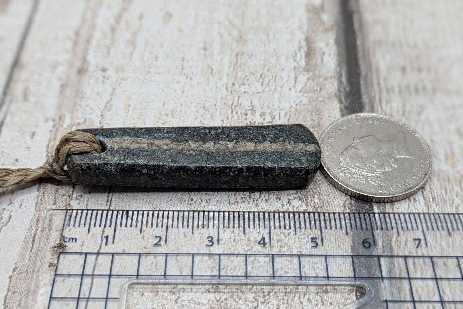 This pendant is hand-carved from ancient Preseli Bluestone, the same dolerite rock carried from the Preseli Hills to form the inner circle of Stonehenge. Set into its heart runs a central line of Avebury Sarsen Stone, secured with high-quality UV resin, echoing the unity of two megalithic traditions: Preseli Bluestone and Sarsen, the very stones of Britain’s most enduring sacred sites.