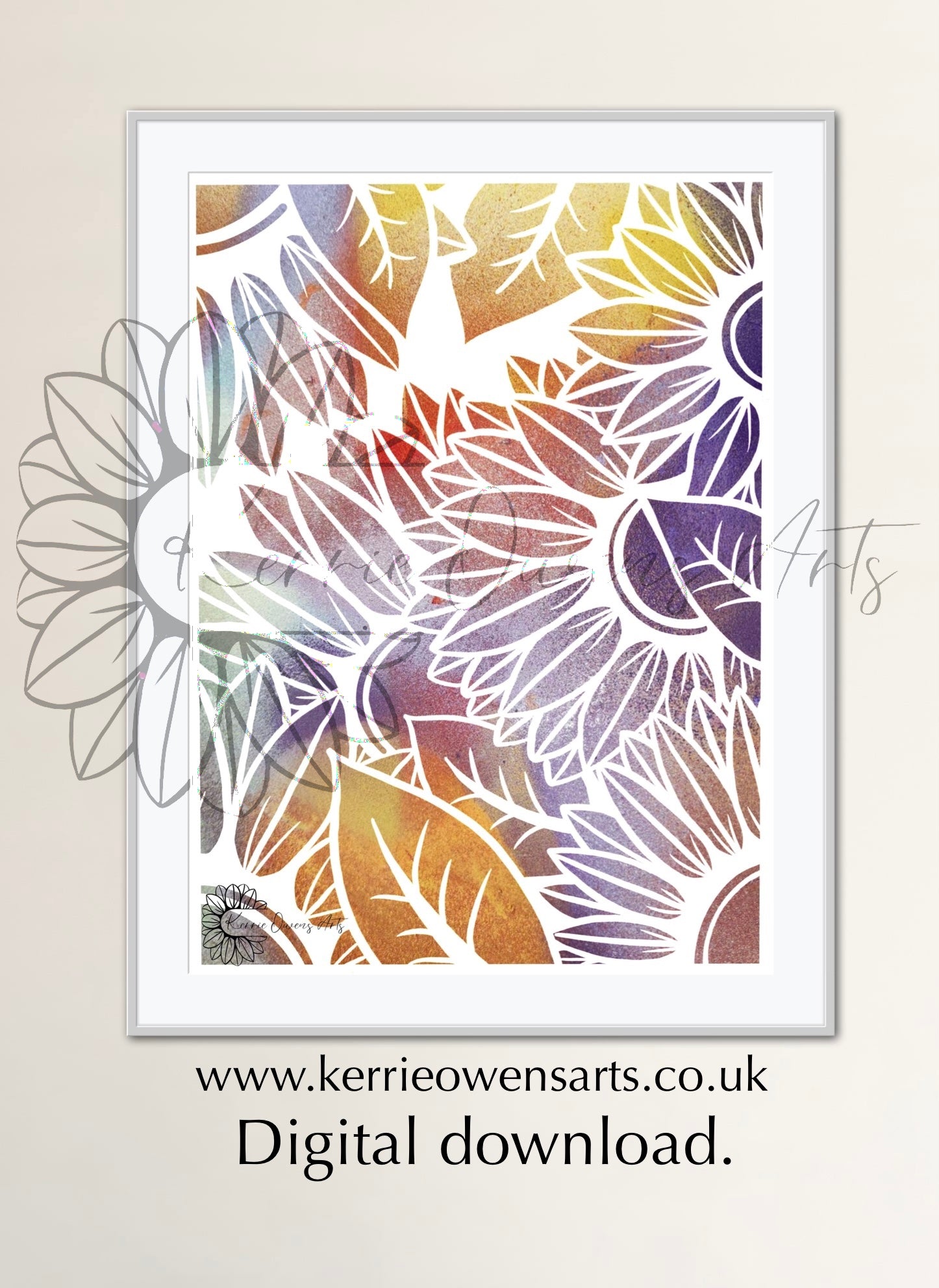 Rainbow spray paint texture sunflowers, mix media digital download.