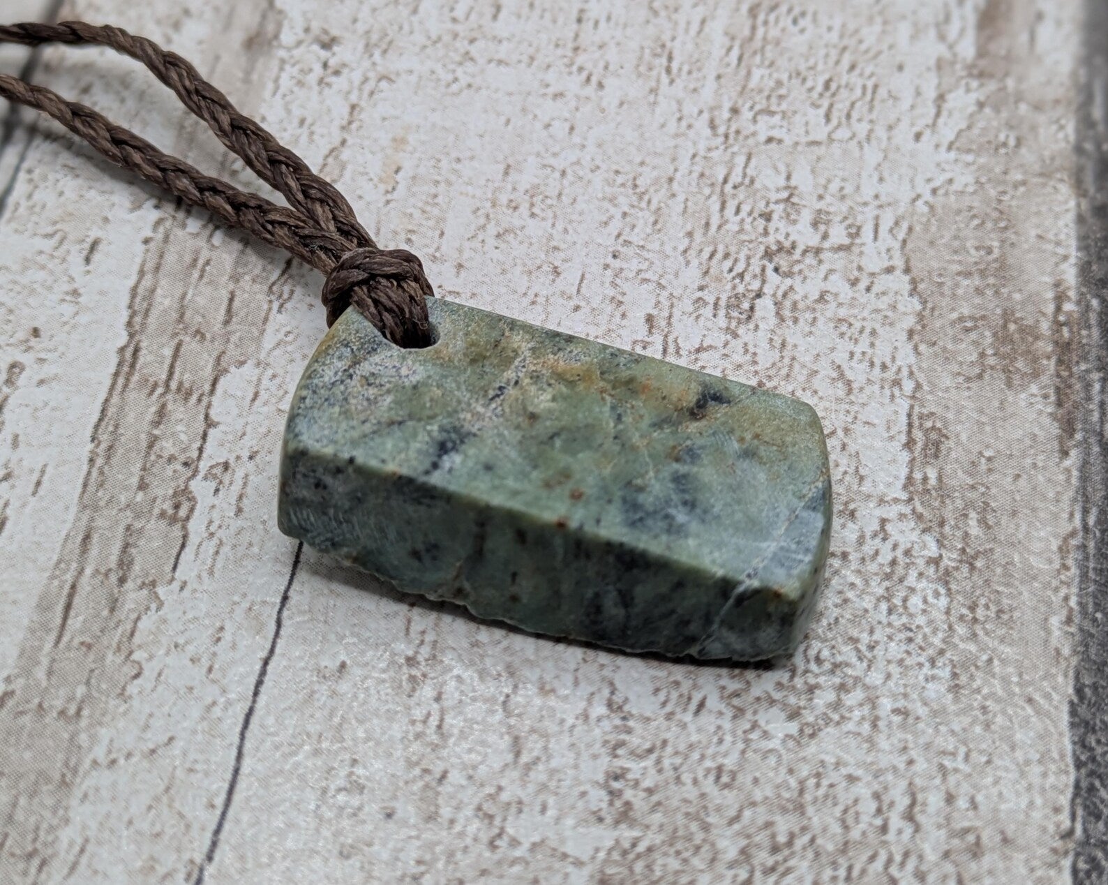 This unique pendant features a slice of genuine New Zealand Pounamu (nephrite jade) taken from the outer weathered portion of a boulder. The front showcases the raw, naturally weathered surface, while the back and sides are smooth and polished, highlighting the contrast between untouched stone and refined craftsmanship.