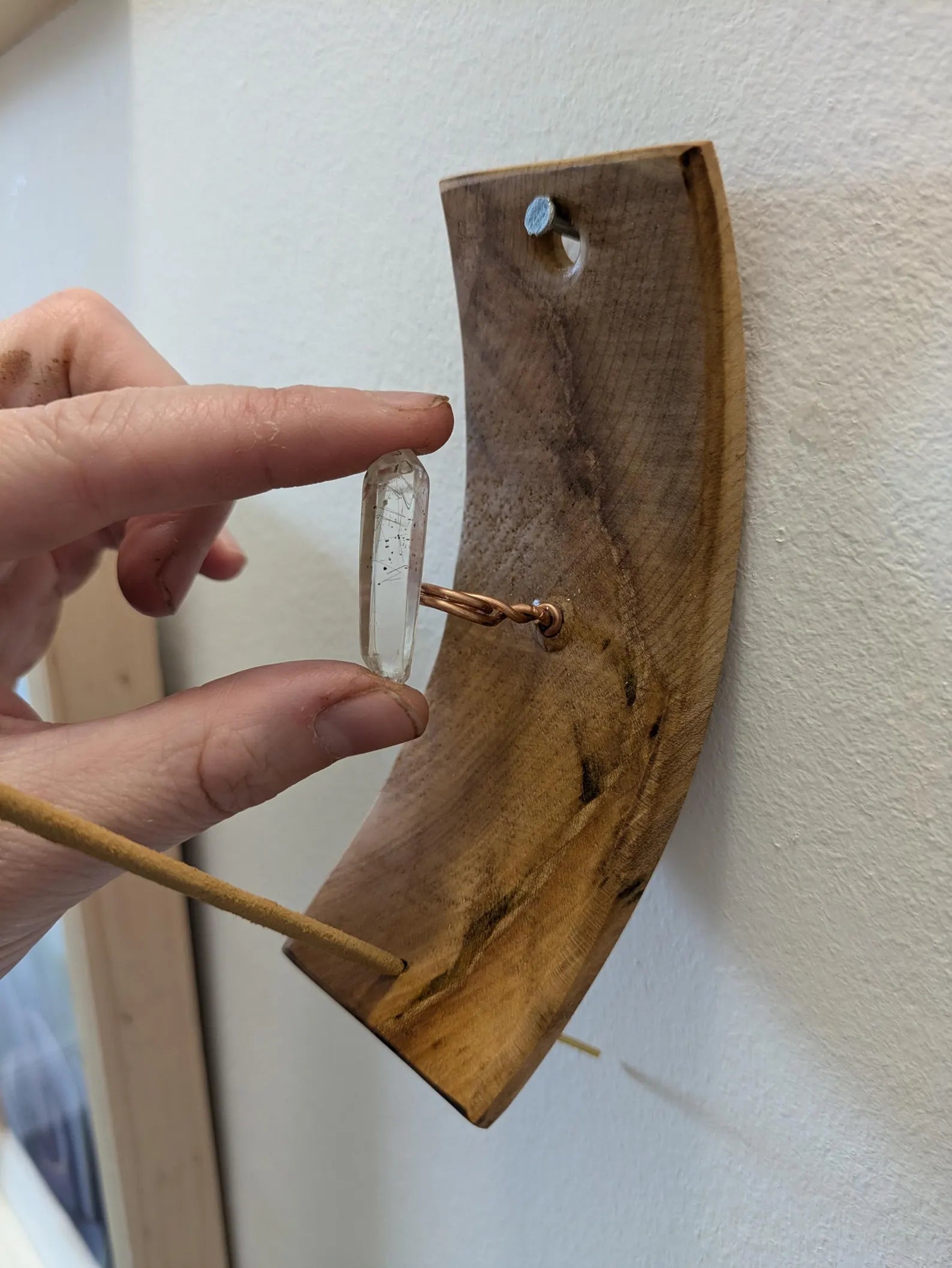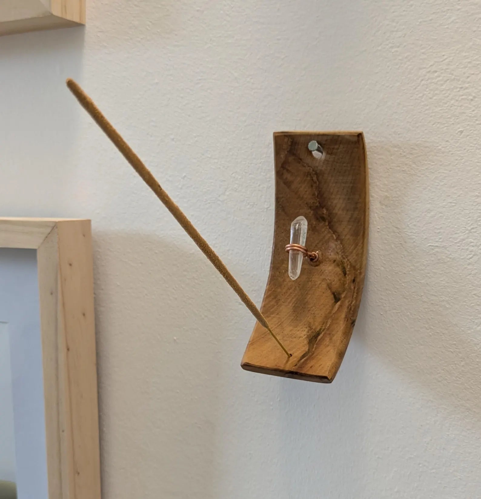 Recycled wood wall hanging incense holder with Tibetan quartz.