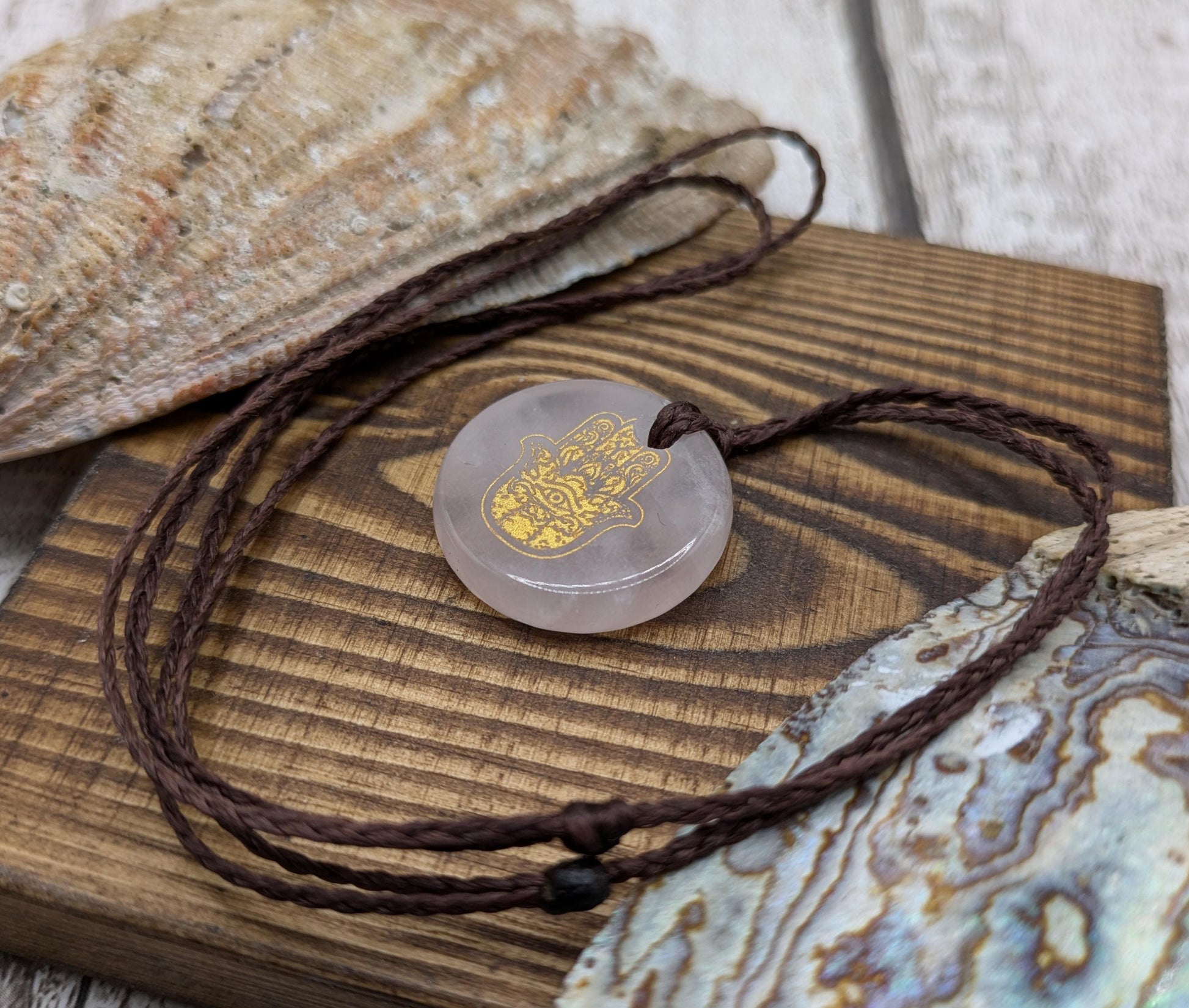 Discover the beauty and meaning of the Small Rose Quartz Discs by Kerrie Owens Arts, featuring an intricately embossed Hamsa hand. These exquisite pendants merge the nurturing energy of rose quartz with the protective symbolism of the Hamsa hand, creating a meaningful piece of jewellery.