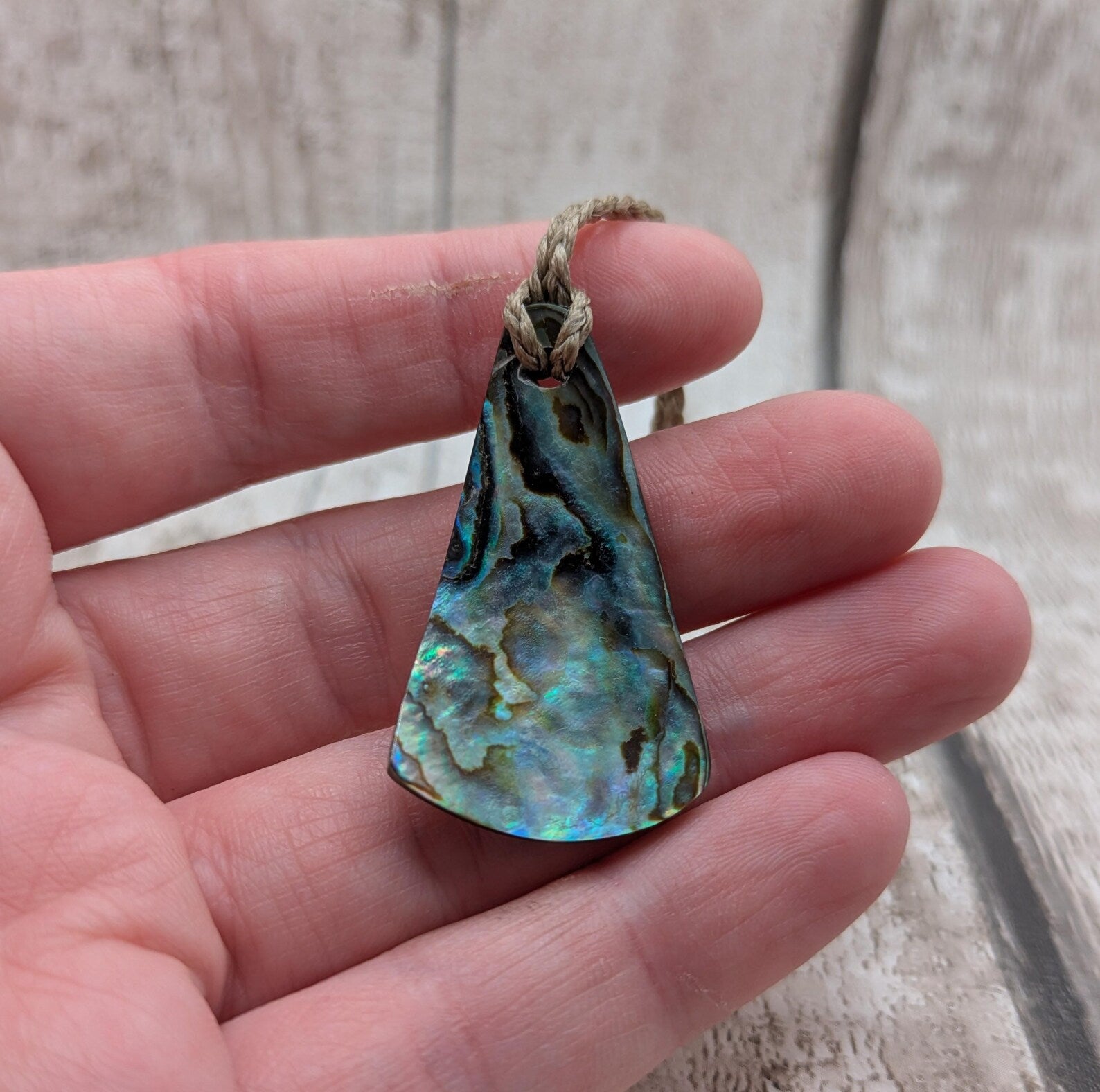 Small New Zealand Pāua Shell Triangle Pendant – Iridescent Abalone Necklace on Adjustable Waxed Cord, ocean themed, natural pattern.