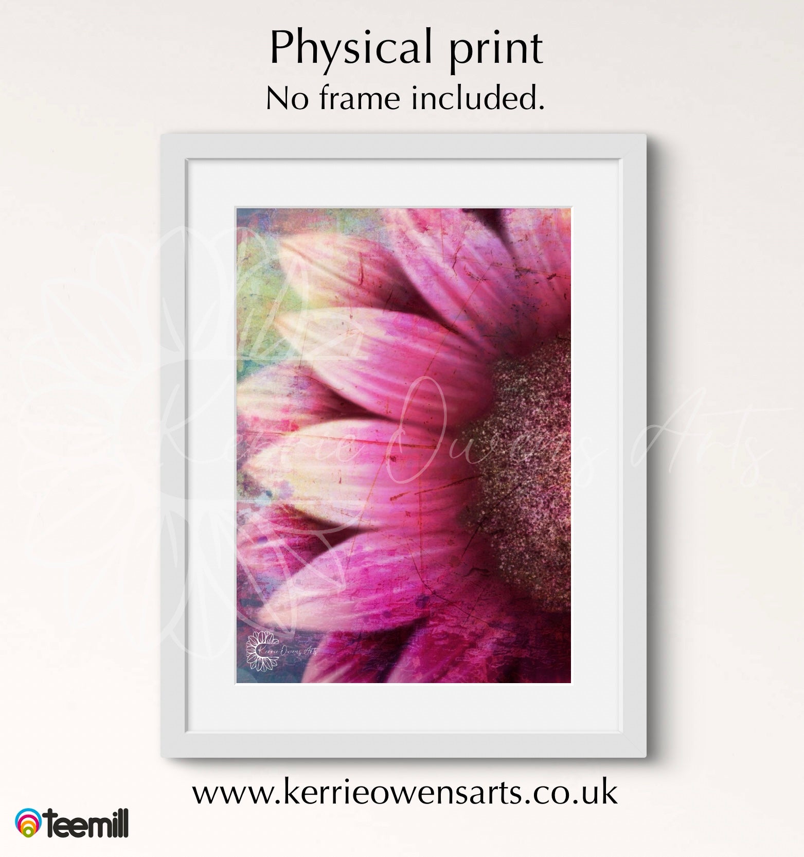 Capture the beauty of nature and add a touch of artistic flair to your space with this stunning poster print. Designed by Kerrie Owens, this print features a textured pink sunflower that is sure to brighten up any room in your home or office.