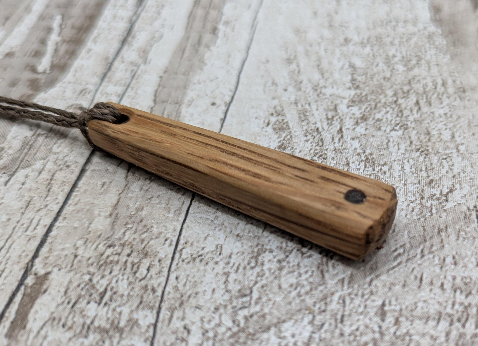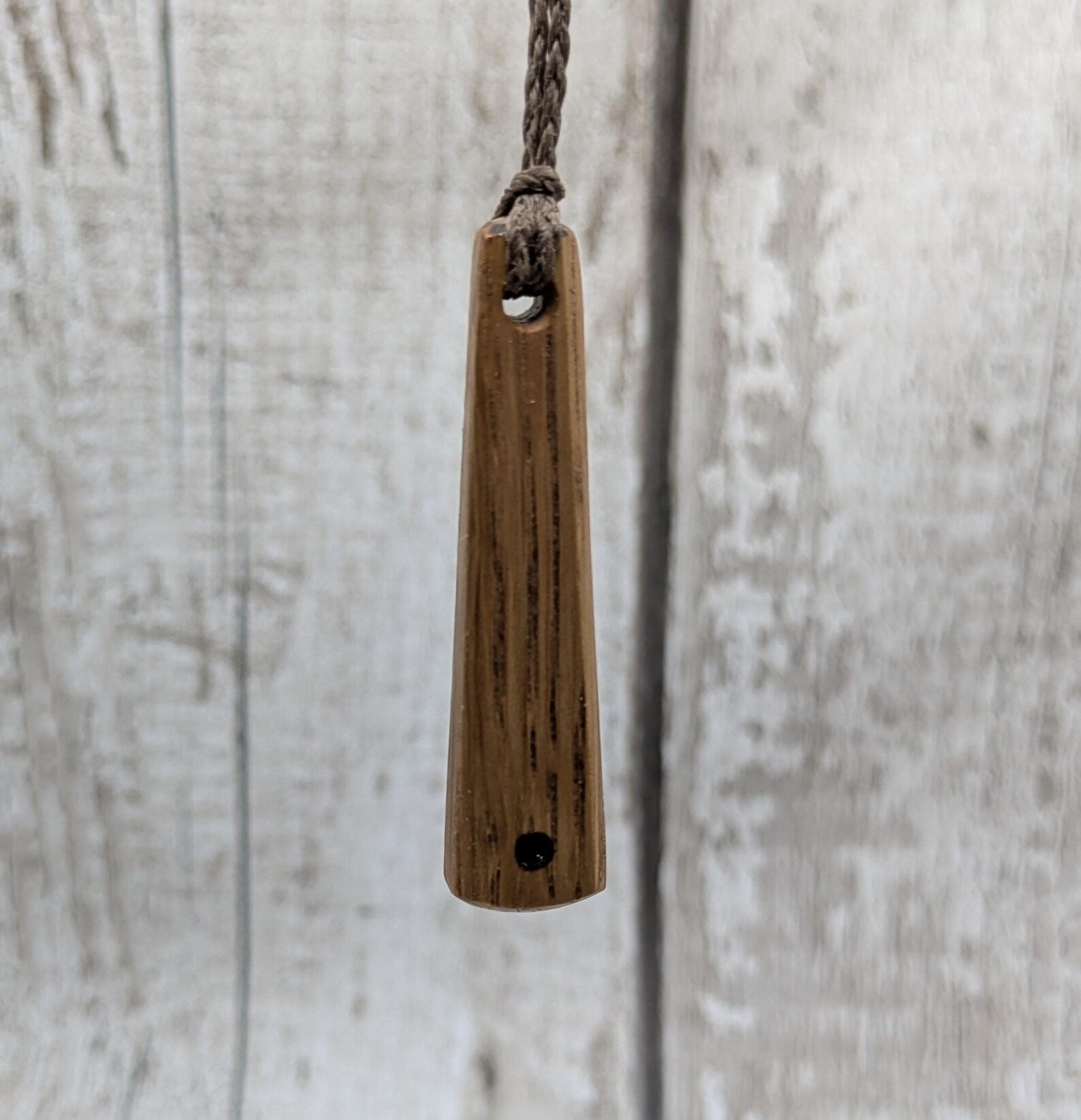 Whiskey Barrel Oak stave teardrop Necklace – Handcarved with Moldavite inlay | Eco Reclaimed and up cycled roimata Wooden unisex Jewellery.