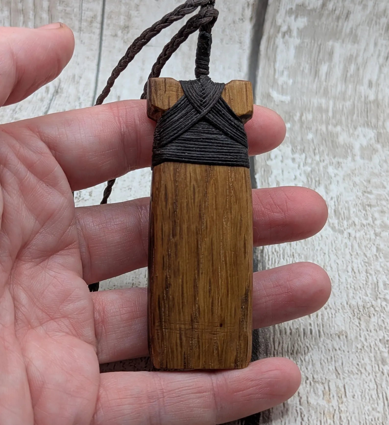 whiskey barrel oak wood hei took adze pendant with abalone shell.